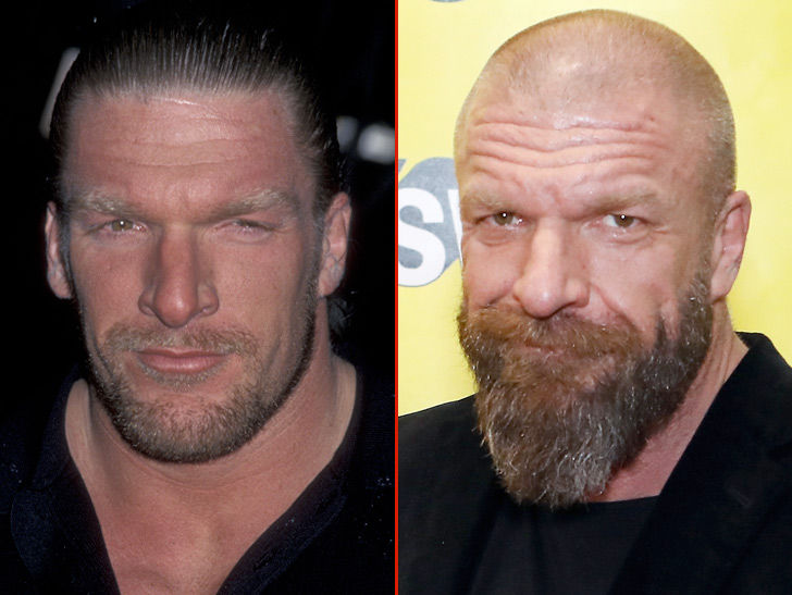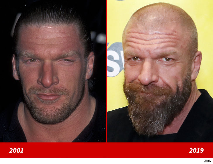 Here’s a 31-year-old version of the professional wrestler at an event in Los Angeles back in 2001 (left) and 18 years later … the now 49-year-old was seen showing off his scruff at a conference in Austin, Texas just last month (right).